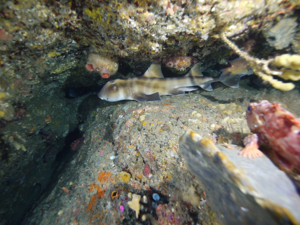 ネコザメが隠れていたり。大型のクロアナゴなども。