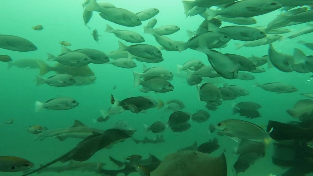 メジナ、シラコダイ、カゴカキダイなどの群れも。
