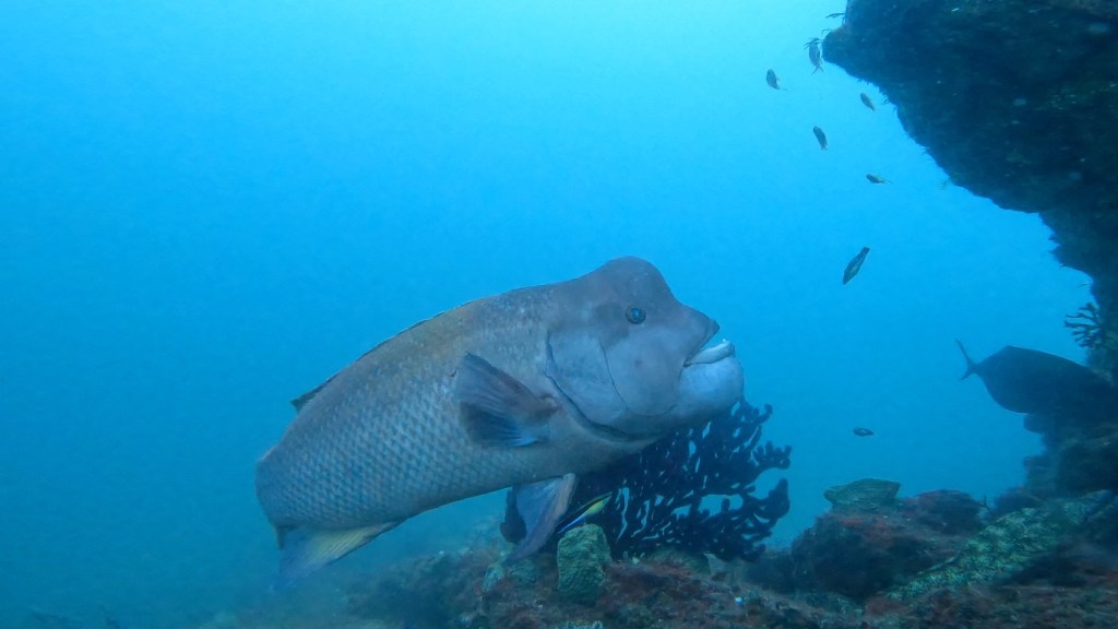 海底神社でコブダイ【頼子】が。ホンソメワケベラにクリーニングされてる姿が。