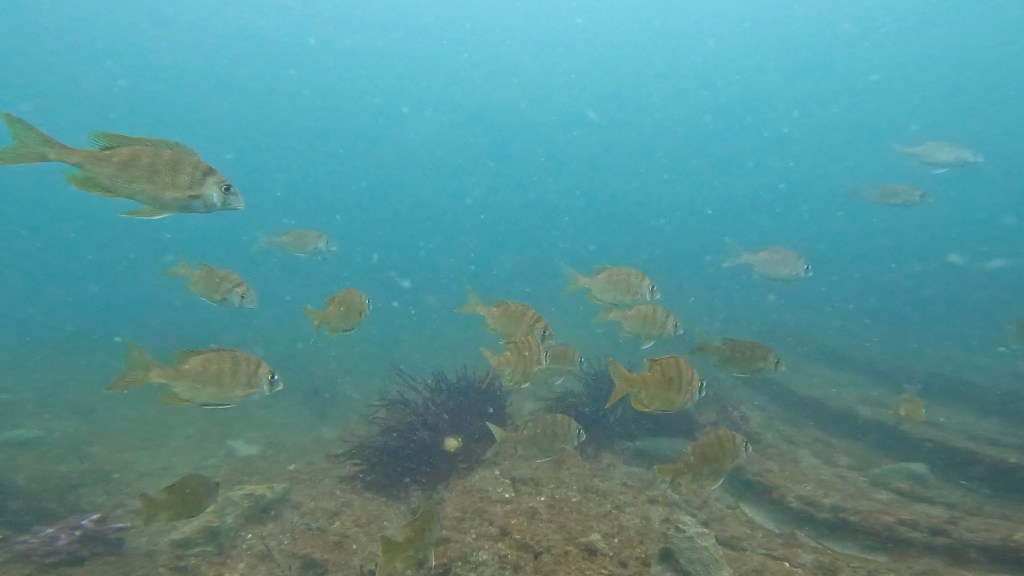 泳いでると近くにホソカマスの群れが水面近くで観察できて。他ではメジナ、クロダイ、イワシと群れが入ってました。