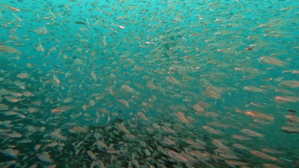 中層では、イサキの群れが入ったり。よくみるとムロアジの群れも。