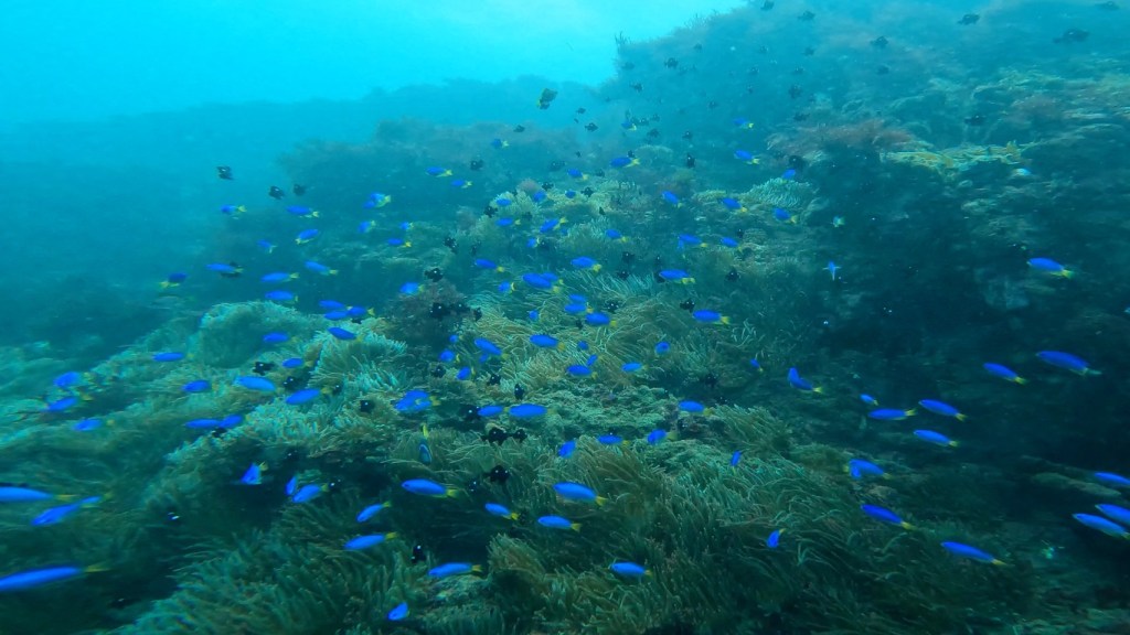 ソラスズメダイ・ミツボシクロスズメダイ幼魚のコラボの群れ。。。