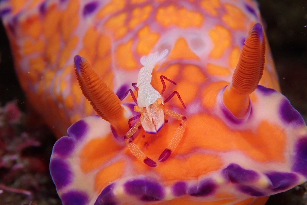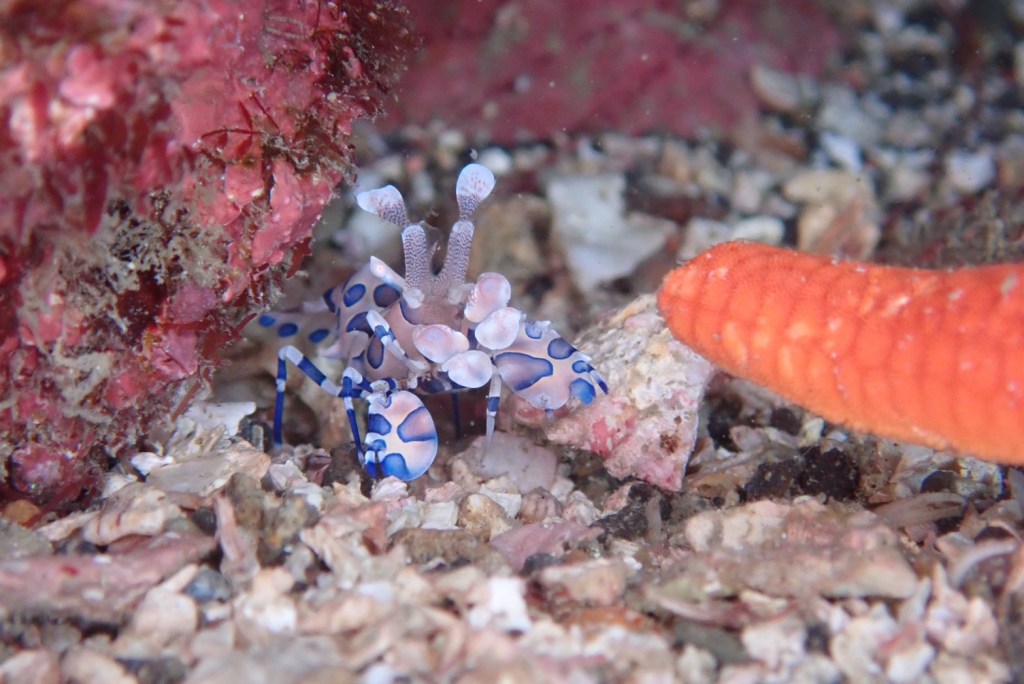 ニシキウミウシに付いていたウミウシカクレエビなどと観察。