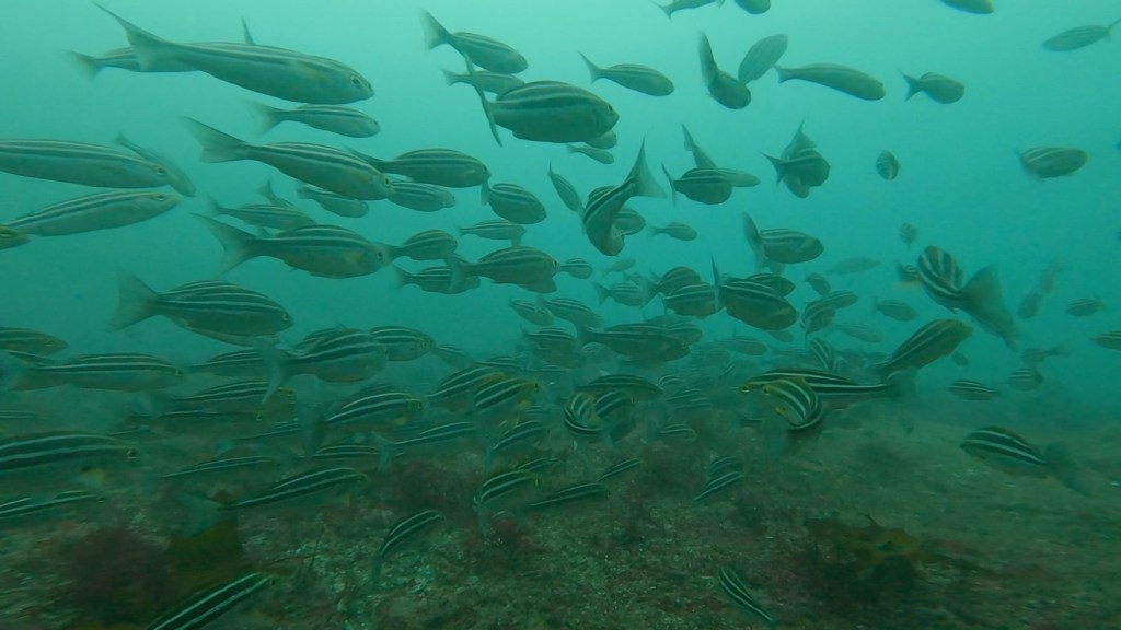 中層では、大型サイズのマダイが4匹きれいにホバリングしていたり。