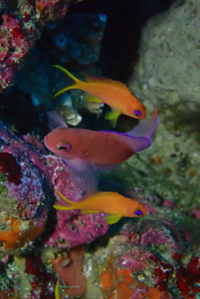 オレンジ色のきれいなキンギョハナダイ群れの近くには、