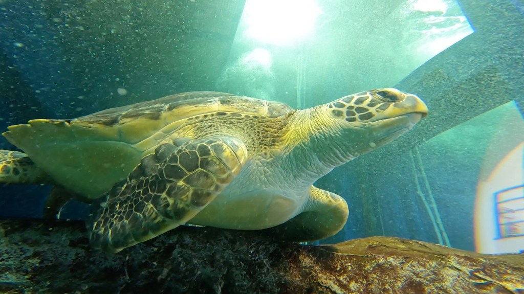 ウミガメは元気いっぱい過ぎて距離感近いです。
