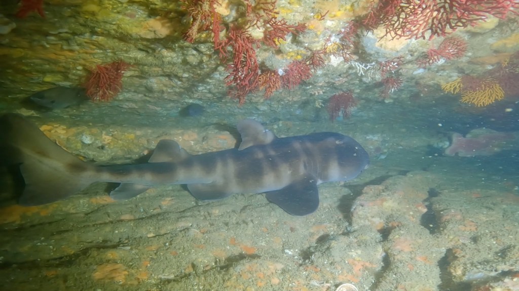 起伏ある地形やネコザメの卵や成魚など。