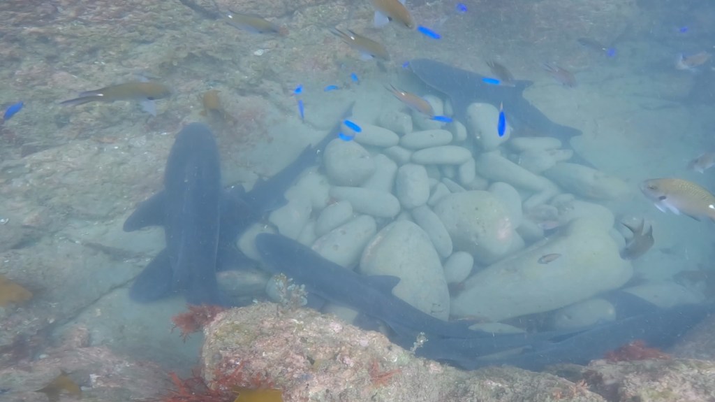 起伏ある地形やネコザメの卵や成魚など。