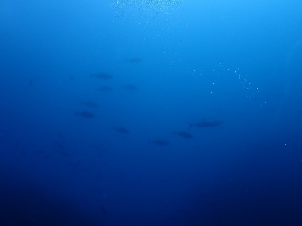 そんな大群の中ではm級のヒレナガカンパチが2匹イサキに突っ込んでる姿がまた迫力あります。