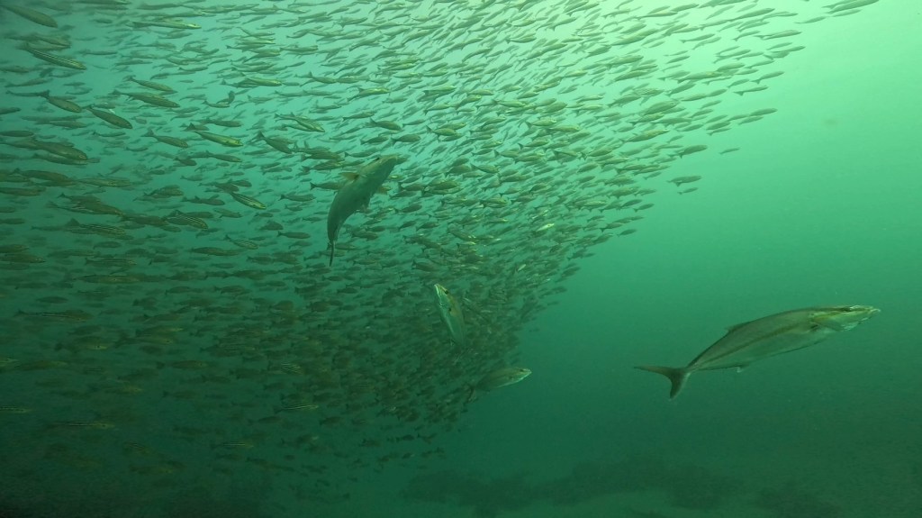 エントリーして降りてく時からワラサ群れがダイバーのまわりを囲んでくれます。