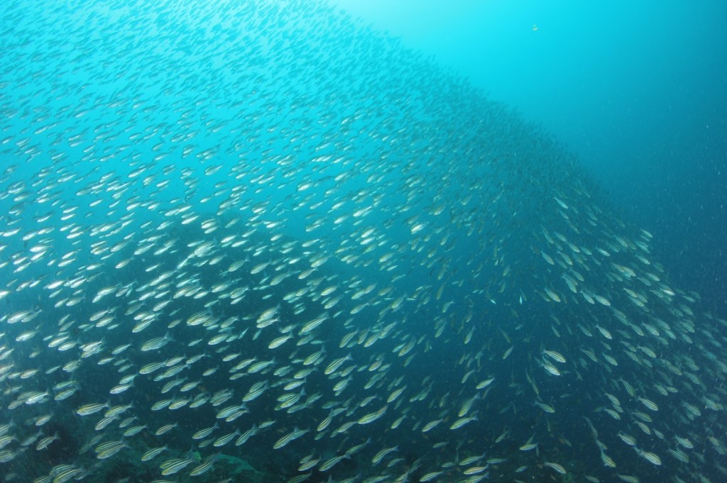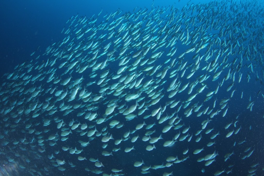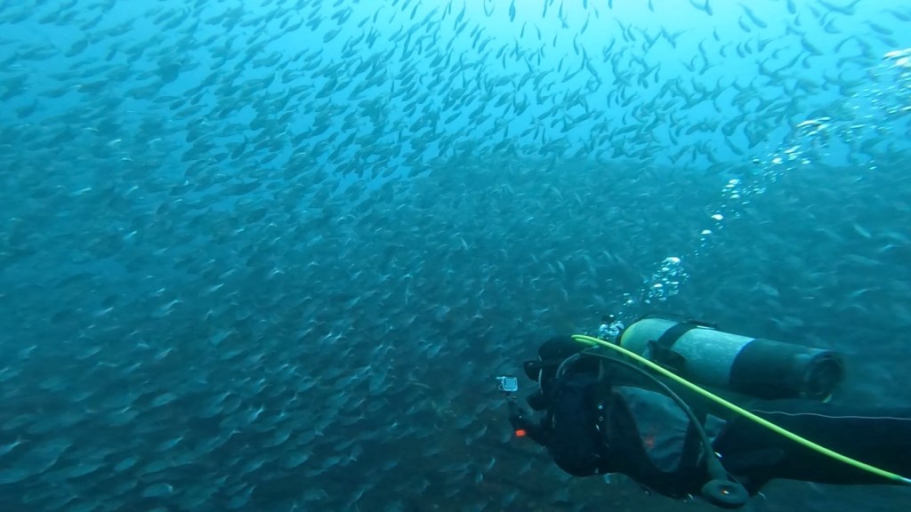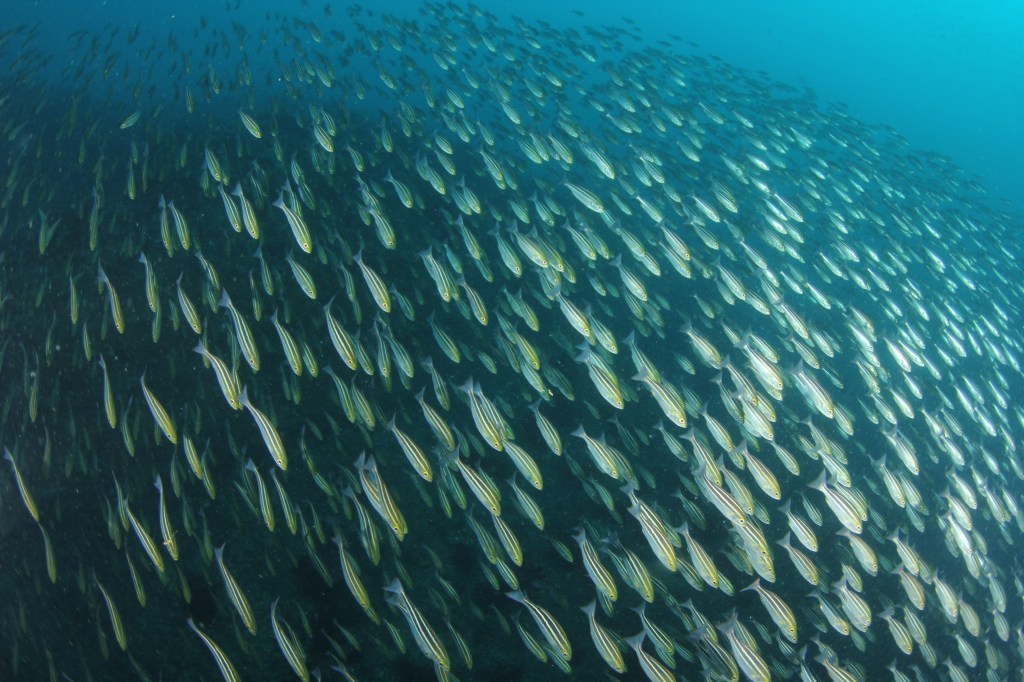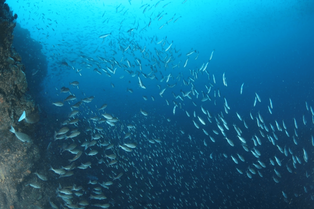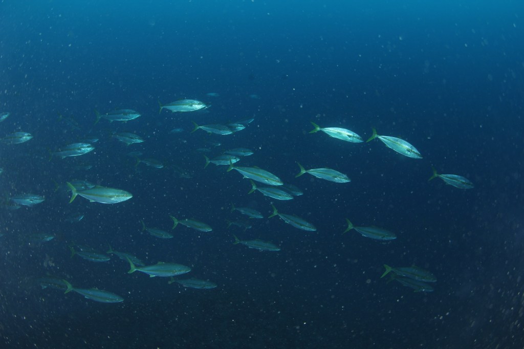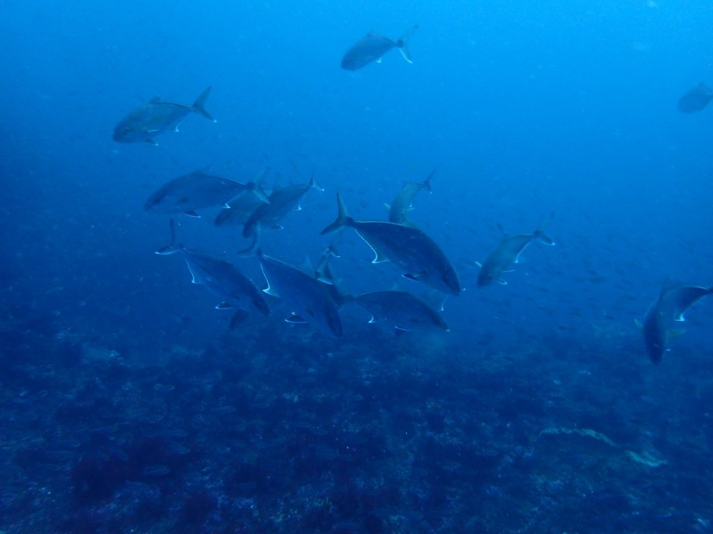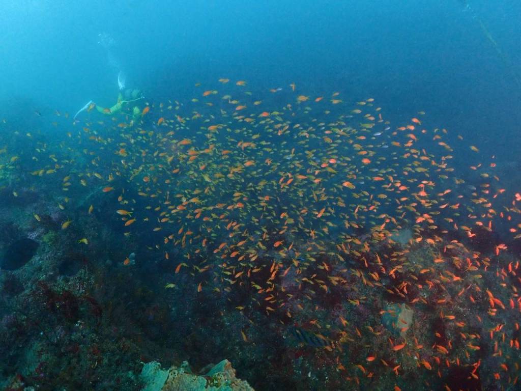 ブイ下から潮の入り方で壁のような群れや回遊魚と出会える機会も。