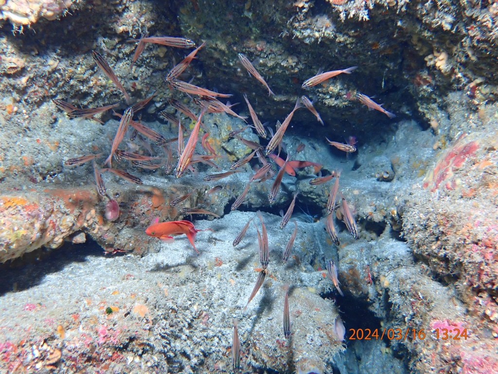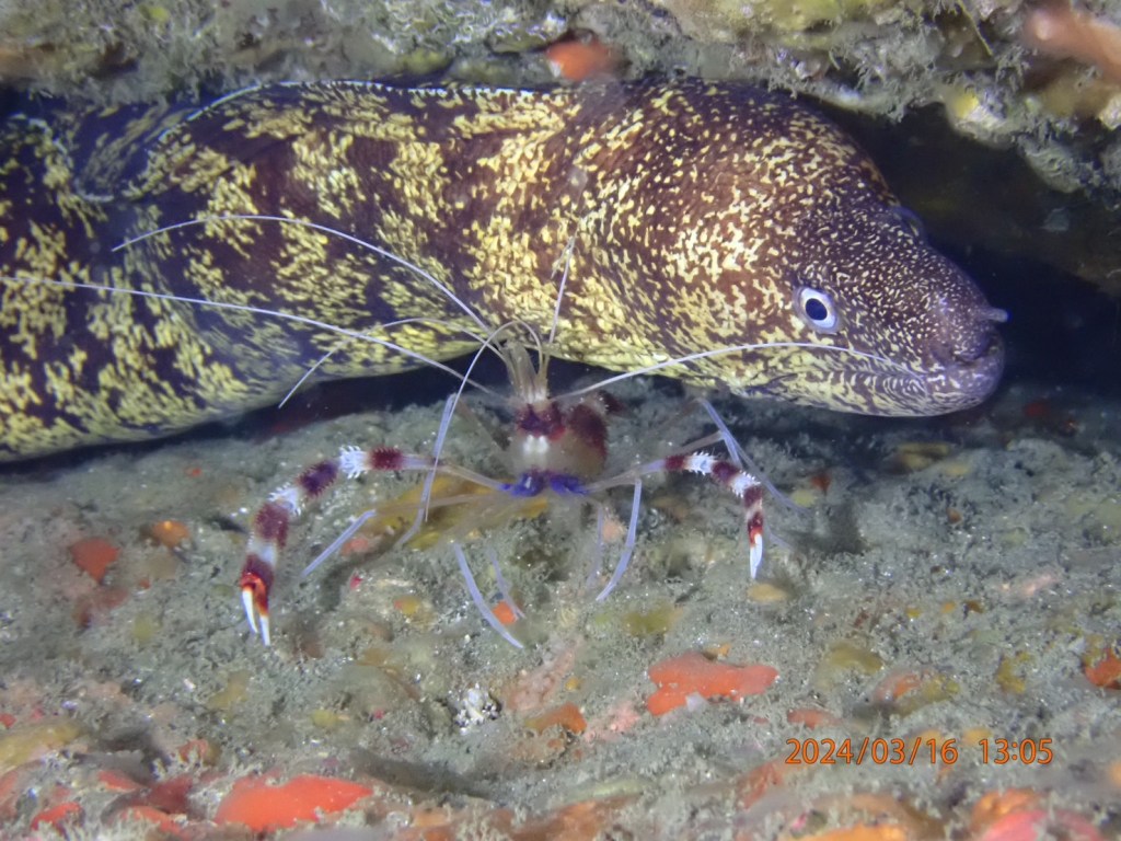 ネンブツダイ・キンギョハナダイなど。ウツボと仲良しなオトヒメエビなど観察。