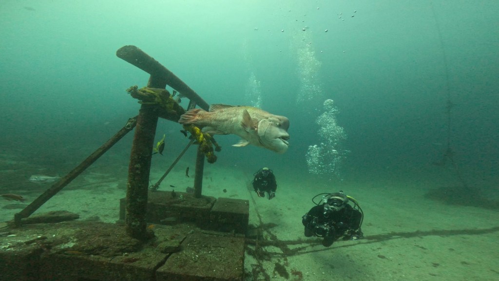 コブダイの頼子がどこからともなく泳いできます。