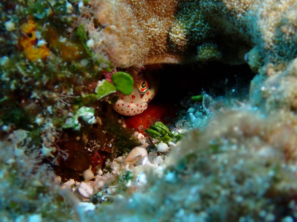ハナヒゲウツボの幼魚。小さい頃は、黒色でこれはこれで珍しいのでおー!!っと。
