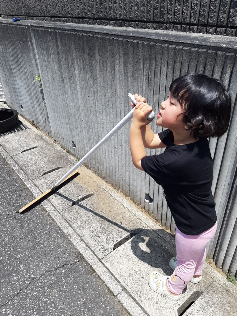 マイクスタンドのように使いこなす3歳児。