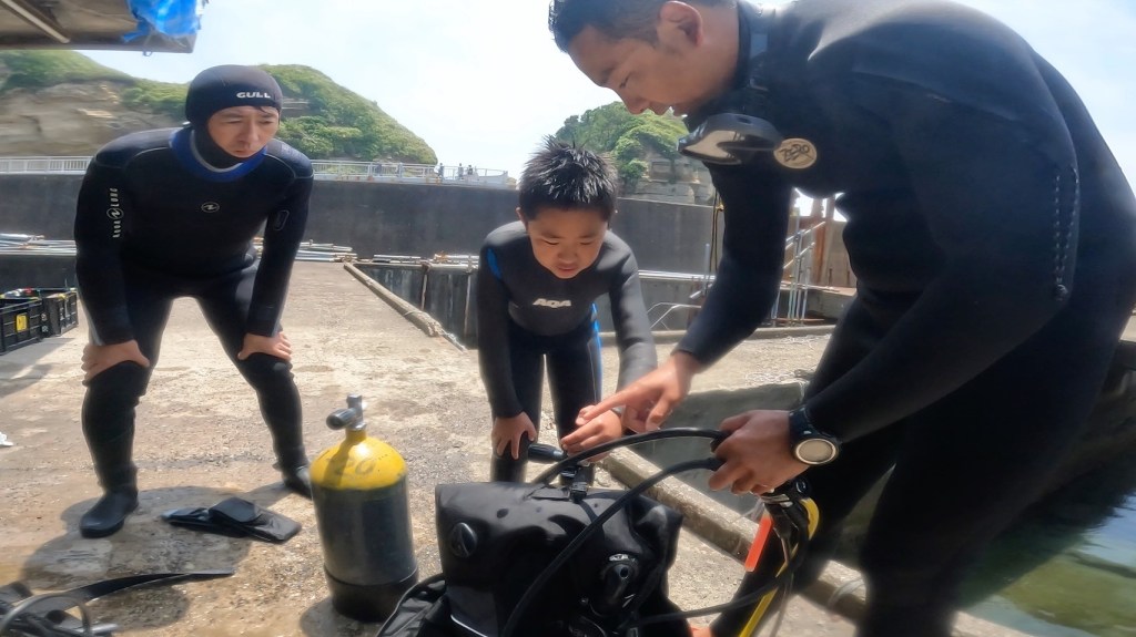お父さんは、一回体験ダイビング経験となり。お子さんは、初ダイビングに挑戦。