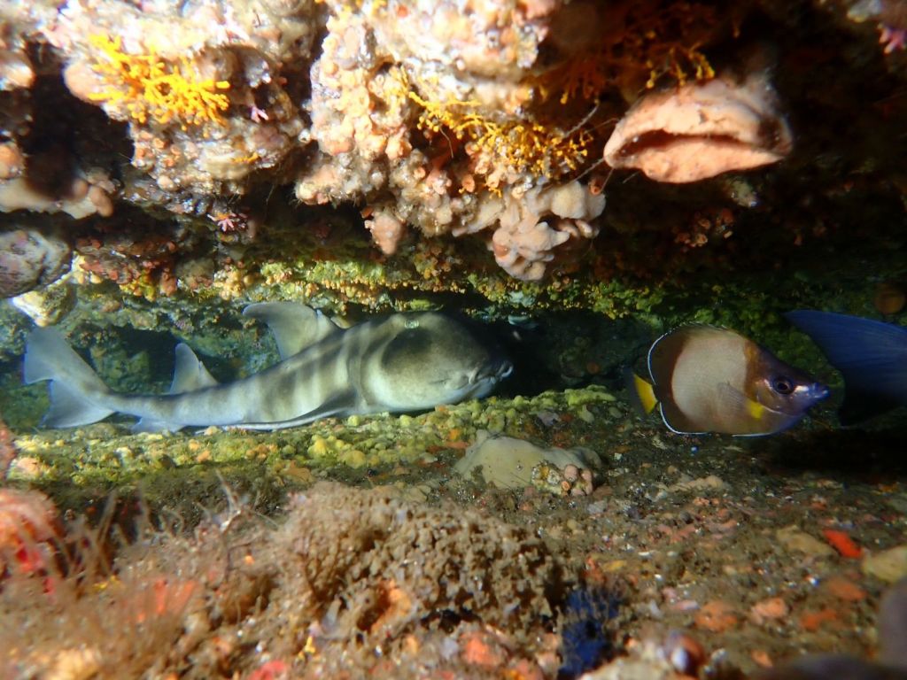 初ポイントの方もいたのでぐるっと地形もみてもらい。砂地側ではサカタザメとの出会いも。