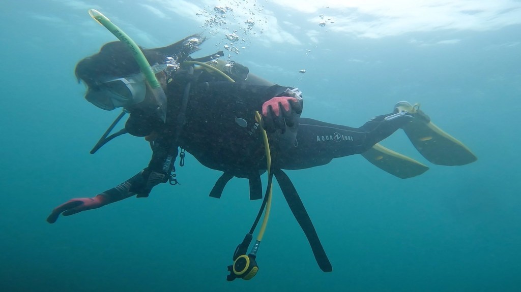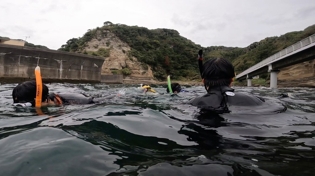 海洋トレーニングでは、ゆっくり泳ぎ。前回の体験ダイビングよりもコースを広げ。