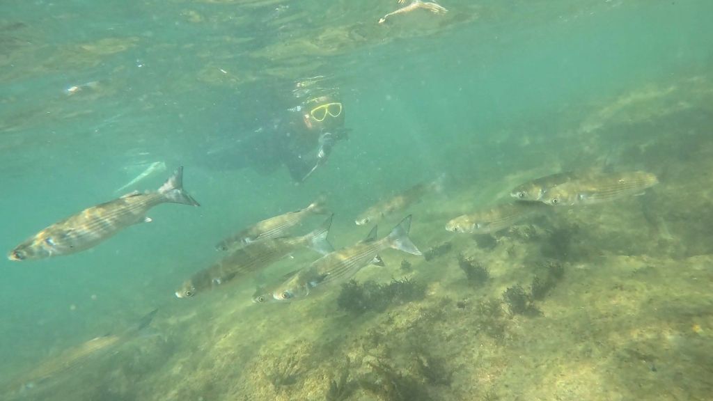 アオヤガラやボラの群れと一緒に写真撮ったり。
