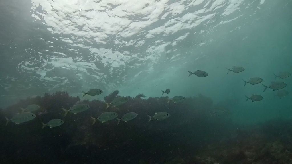 ギンガメアジっぽいのが群れて泳いでます。最初、単体で日に日に増えてきてます。