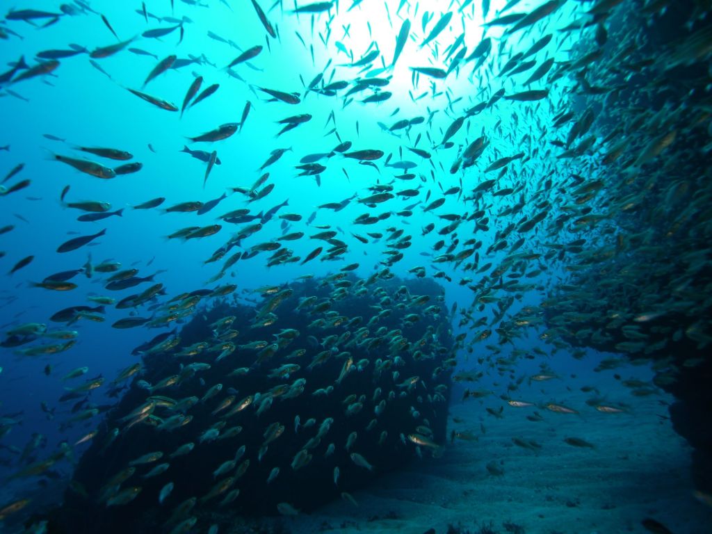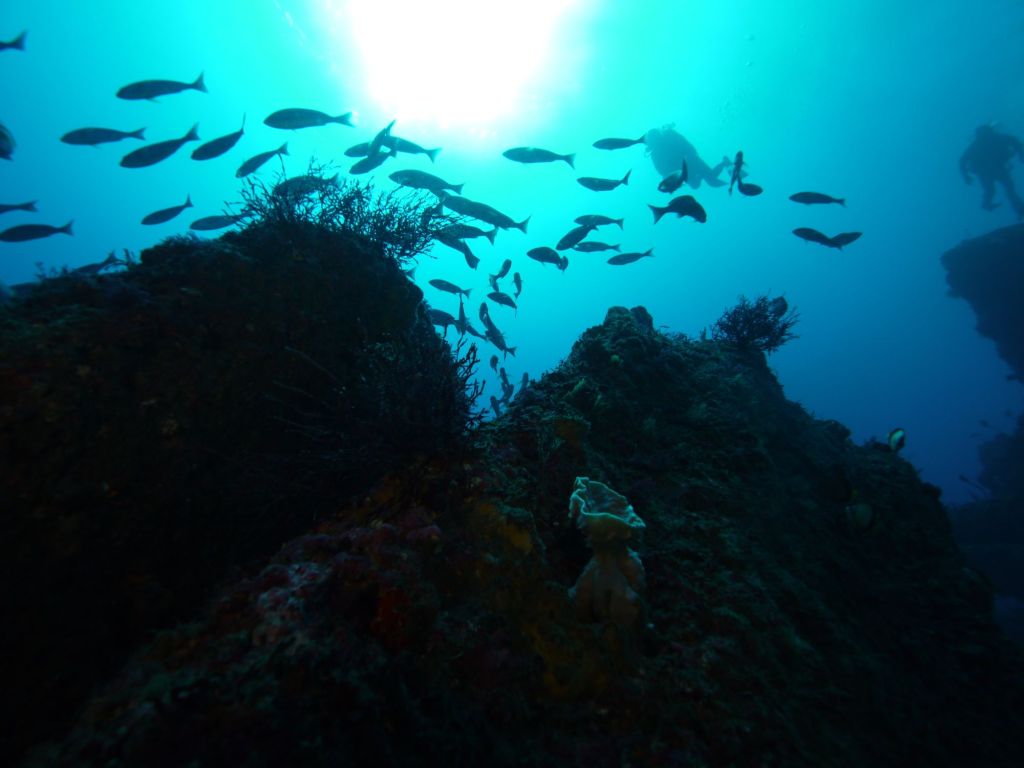 ボートダイブでは、沖に行けば行くほどきれいな潮が。エントリーすると真っ青な水中世界。