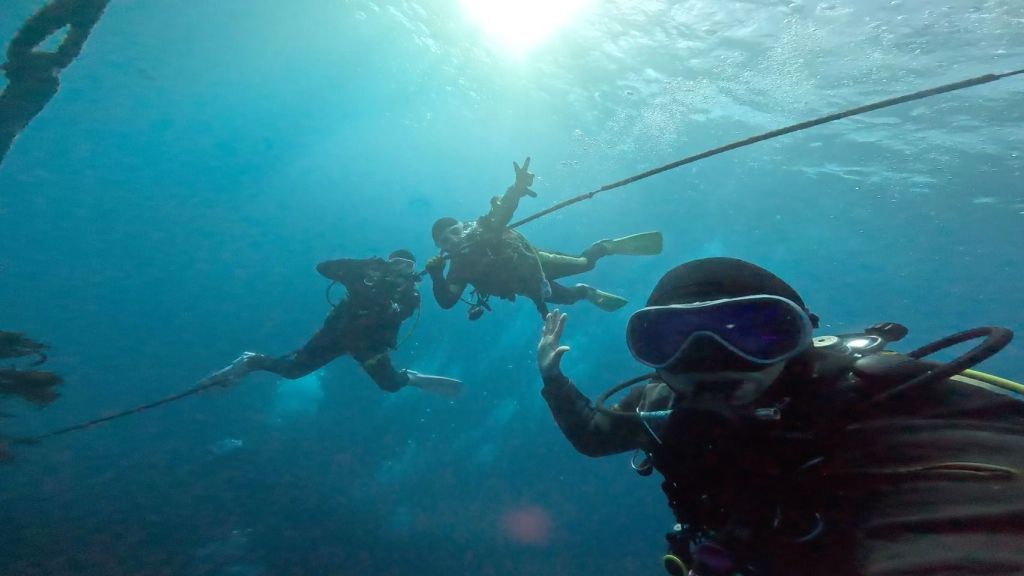 上がるときは、下から上を見上げるとダイバーや船底が見えるほどの視界。