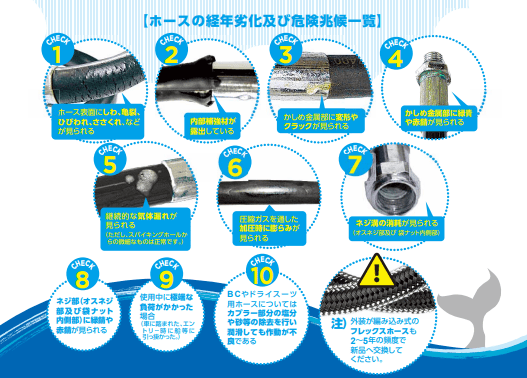 日本スクーバ協会が推奨しているのは、2年から5年以内に定期的にホースを交換される事を強くお勧めしてます。また、下記の ホースの『危険兆候』が見られた場合は、ご購入後の年数に関わらず必ずホースを交換されてからダイビングされる事を重ねてお願い申し上げます。