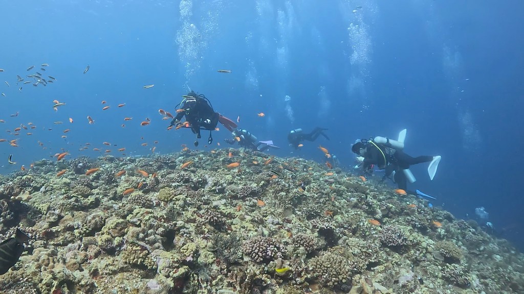 地形沿いでは、ハナダイやカスミチョウチョウウオが沢山群れていて。