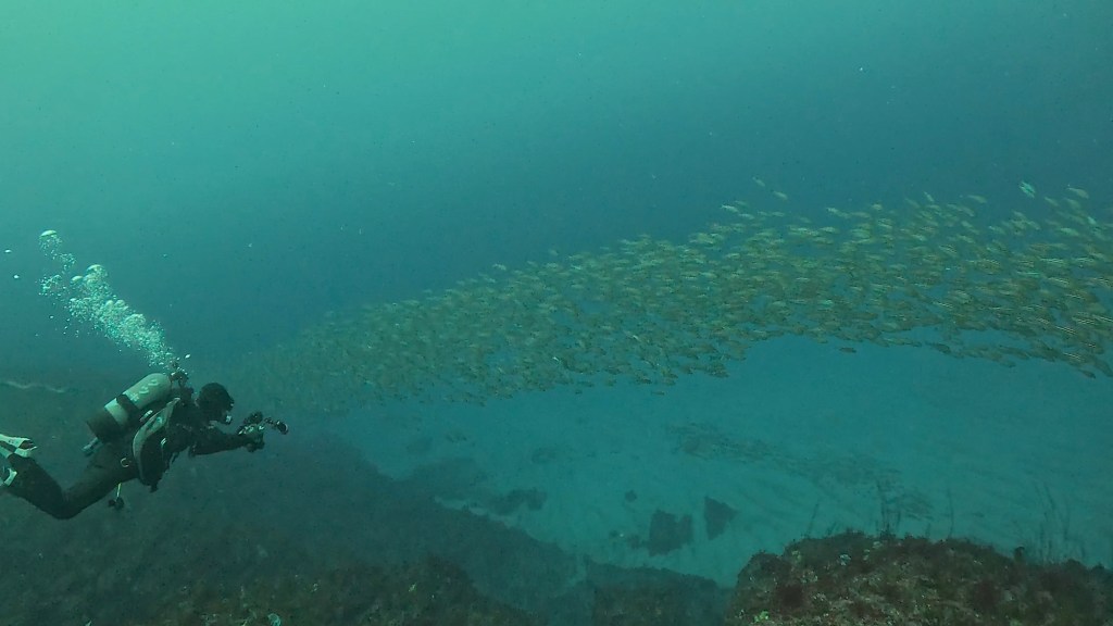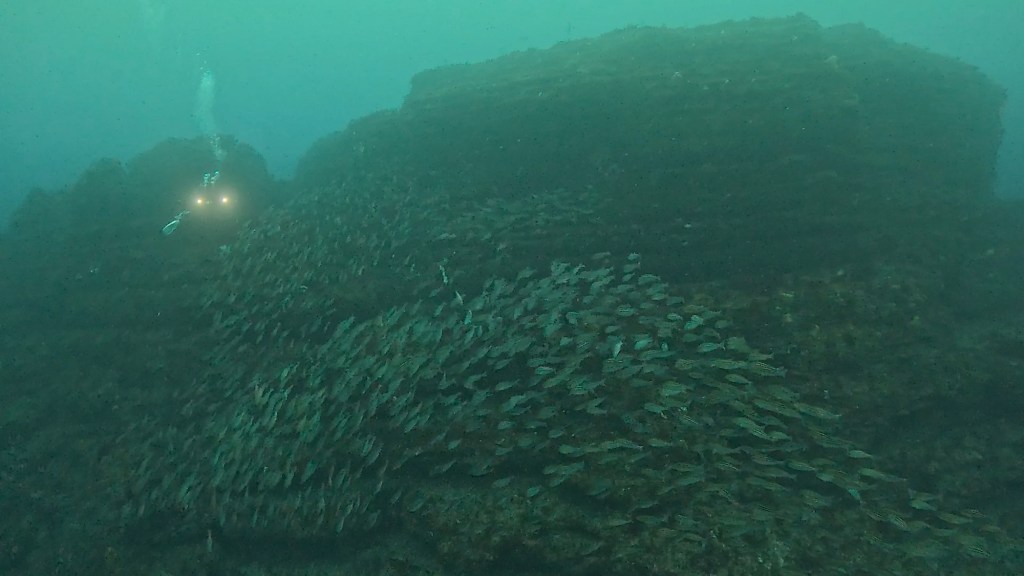 所々群れが多くて視界が抜けたときに魚影、くっきりみえる地形などをご案内。