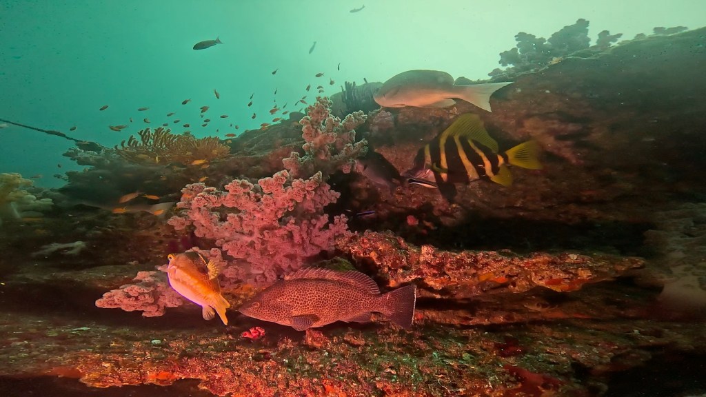地形沿いに進むとオオモンハタやテングダイなどの良いサイズの種類と観察。