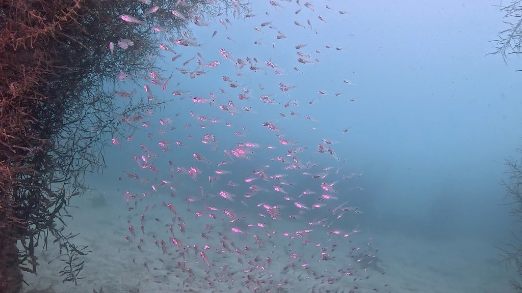 ネンブツダイ幼魚群れやアカエイなど。
