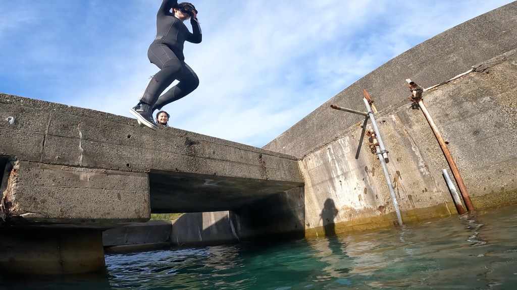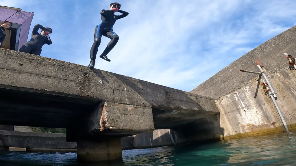 毎回、潮が上がるタイミングで開催の飛び込みチャレンジ。今日も飛び込むチャレンジャーが。