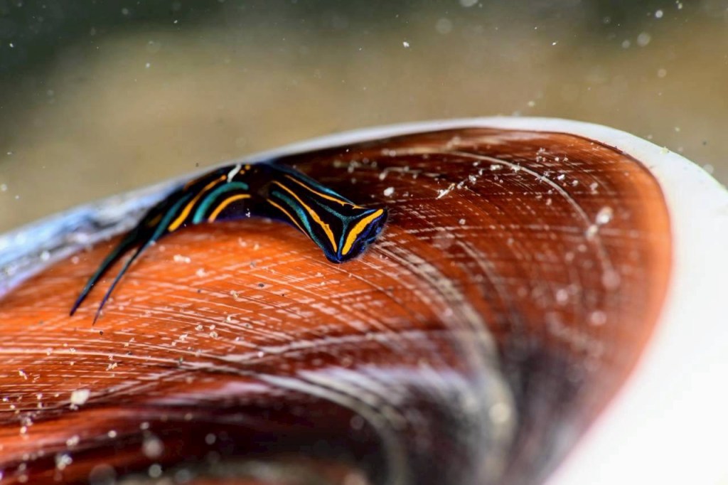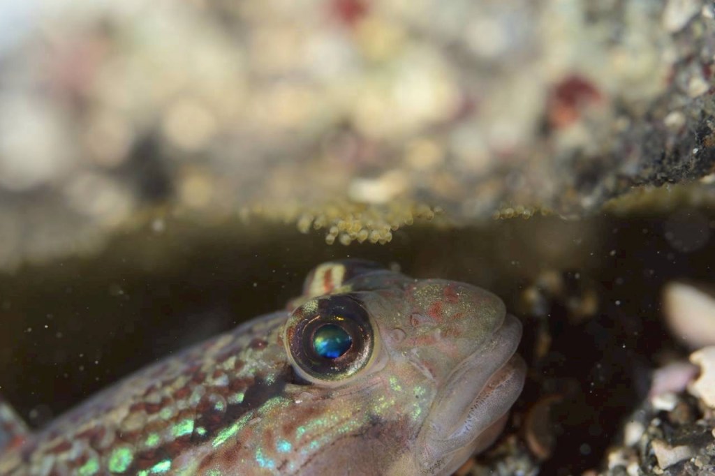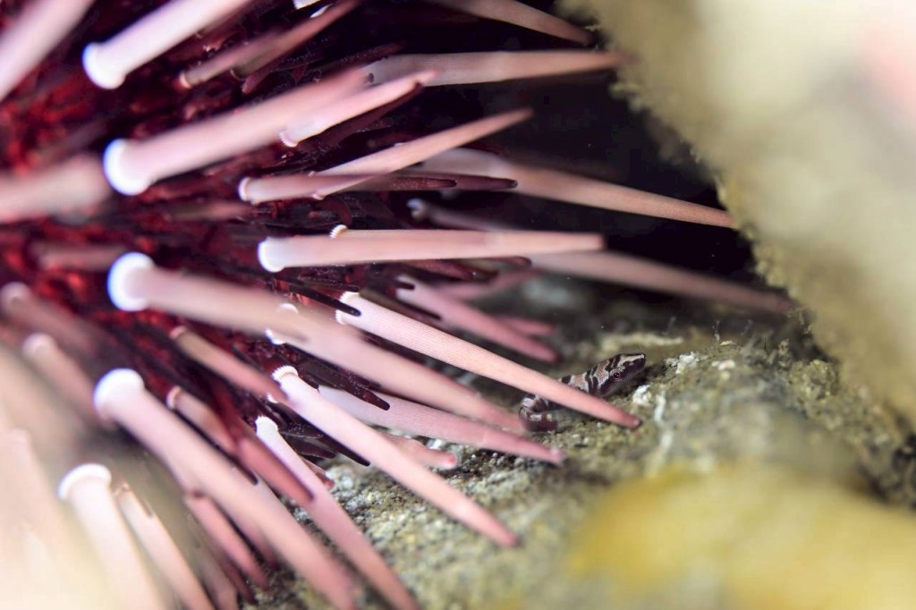 クツワハゼの産卵シーズンで卵守りが目立って参りました。ウニ近くにホソウバウオ。