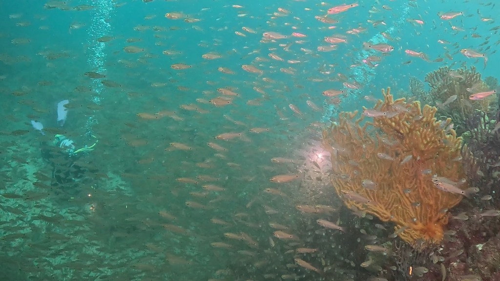 ネンブツダイ、キビナゴ、イワシと凄く群々です。そこにツムブリか入ったりも。アオヤガラの群れはネンブツダイを上手に追い込みしてるシーンが観察出来ました。