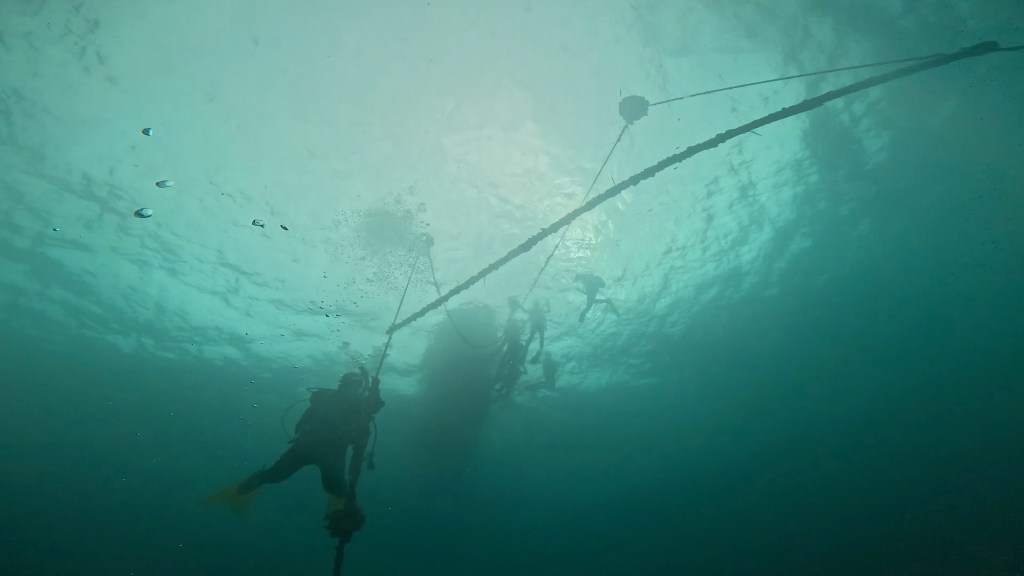 エントリーして安全停止ラインからブイ下がみえます。上を見上げるとまたダイバーさんが絵になります。