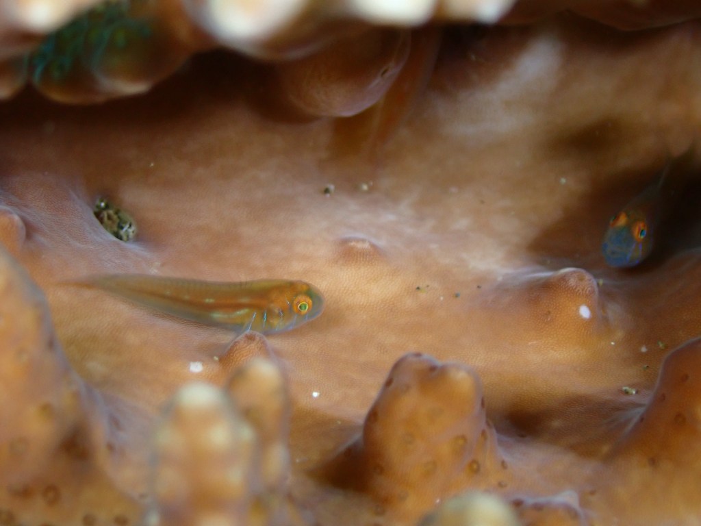 オドリカラマツには、アミメハギが成長した個体や。テーブルサンゴには、アワイロコバンハゼ。