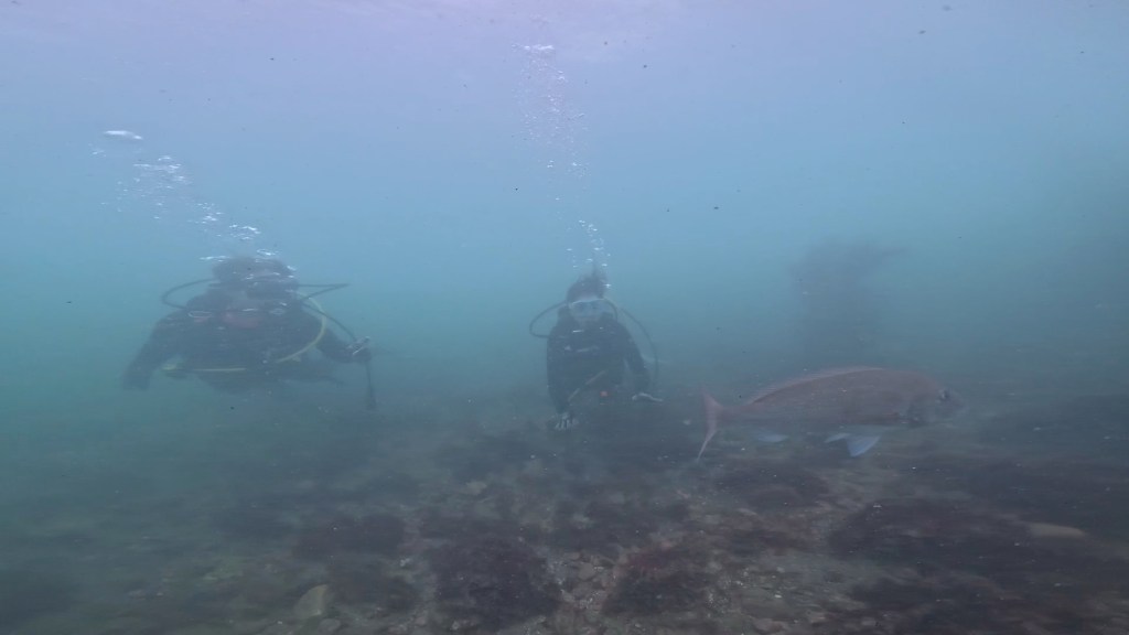 FUNDIVEコースは、手前から少し奥までコースを取りマダイやアオヤガラの群れなどを観察。