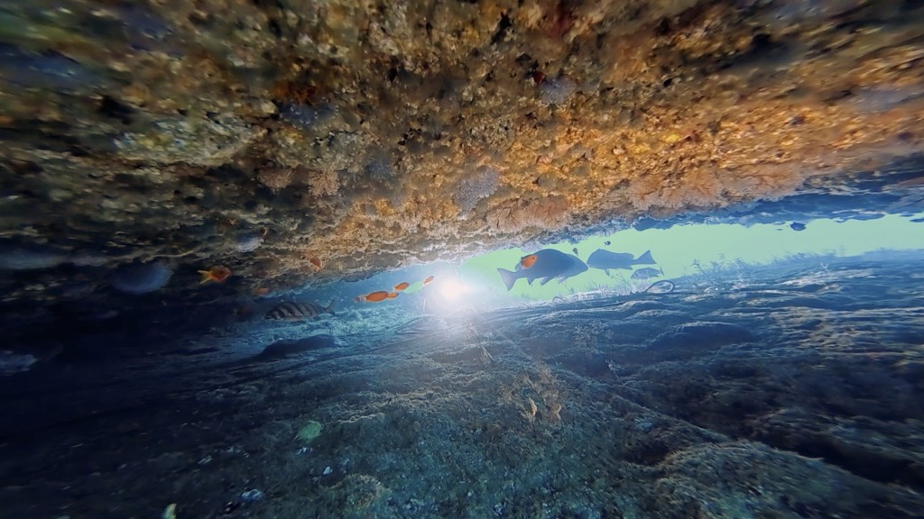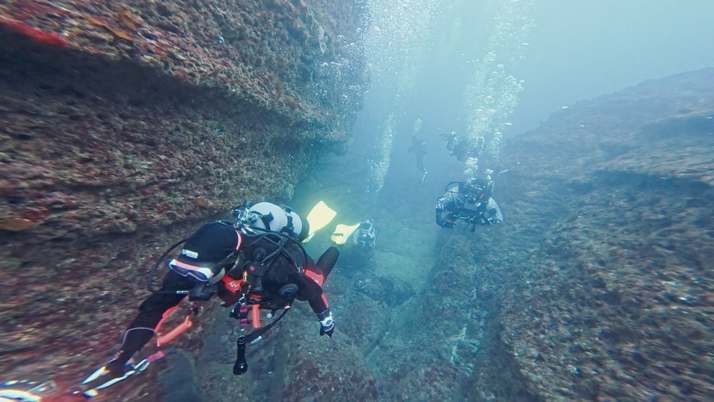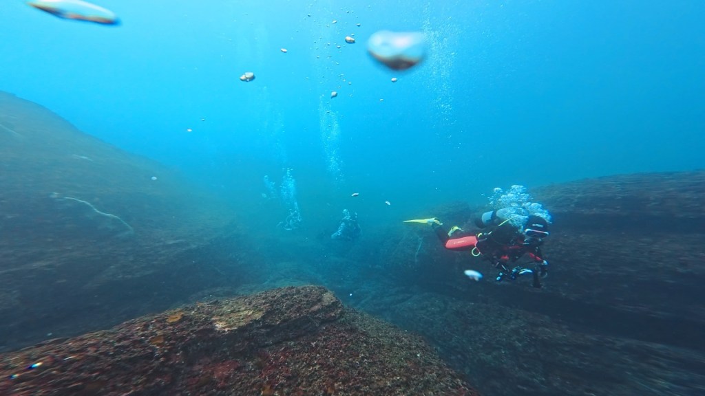 勝浦のダイナミックな地形を堪能しつつ。前半では、ウミガメ登場にみんなで観察。イサキ、タカサゴ、メジナなどの群れが中層を泳いでたり。