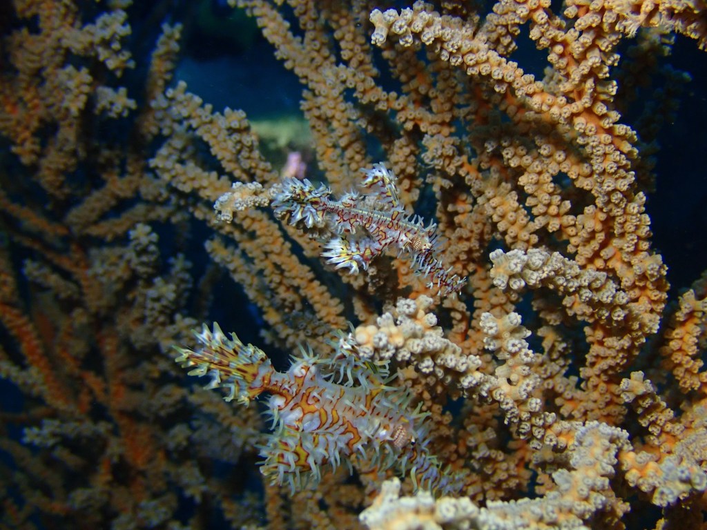 ウミエラにはアオサハギが隠れてたり色合いやサイズ感がまたかわいい。
