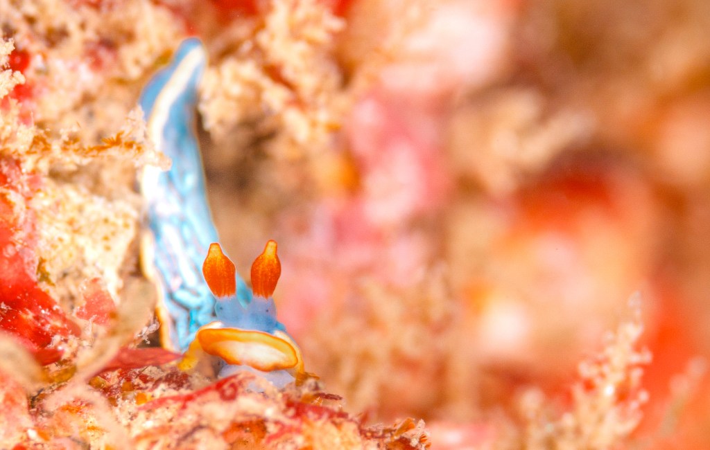 眼点がくっきりみえると一気に表情がでるウミウシ。口もともタラコ唇のような表情がまたかわいいです。