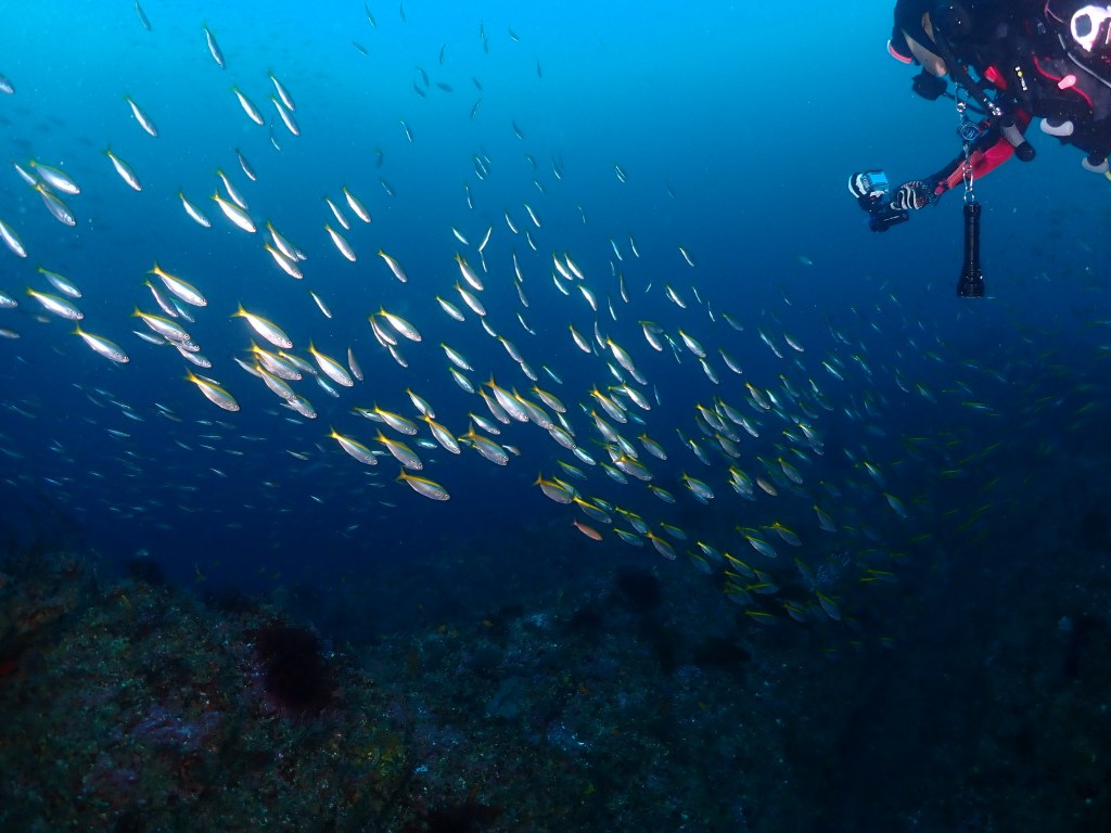 沢山潜られてる方でそんなところもみて動いて魚の向きを観察しつつ狙ってもらいました。潮の流れが早い中でも群れに寄って捉えた写真。