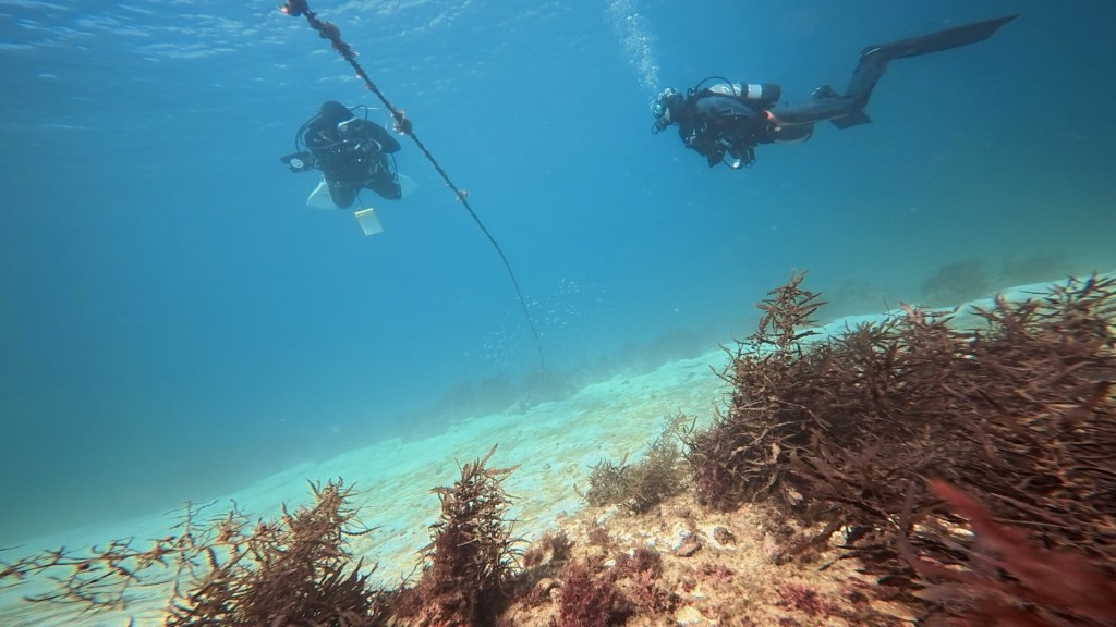 砂地から海藻エリアとゆっくり泳いでいきました。