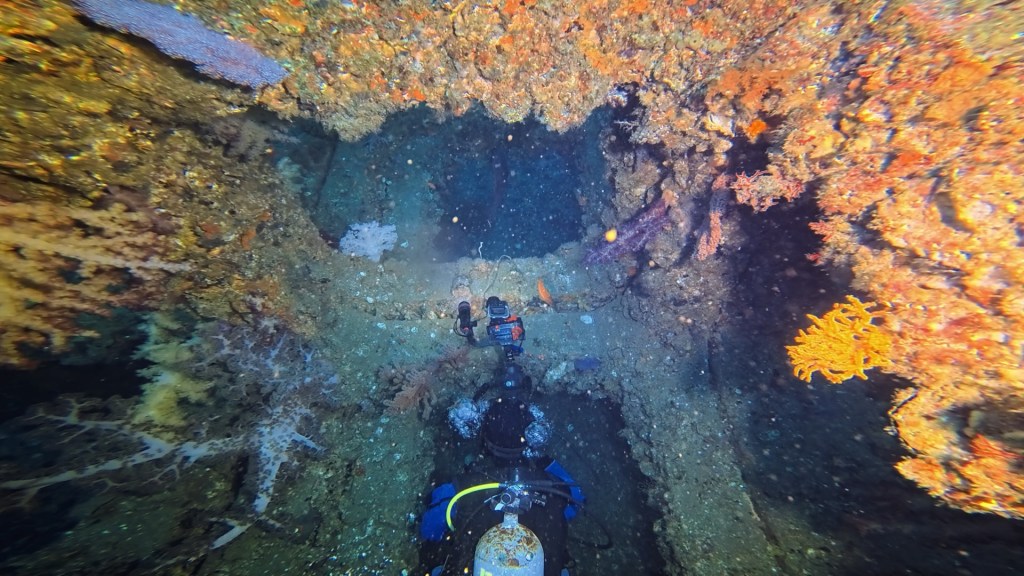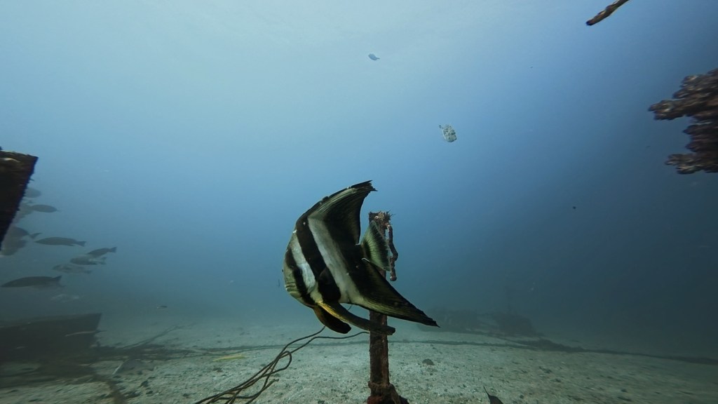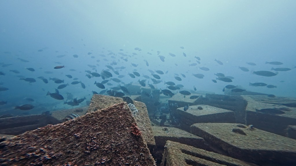 大きな漁礁が入ってるので探検チックに潜れるのも良いです。イサキの魚影が一気に入ってきて川のように泳ぐ姿も良かったですね。