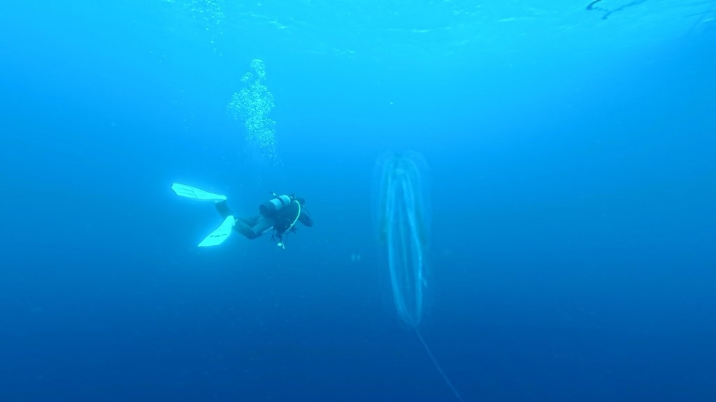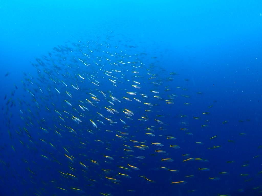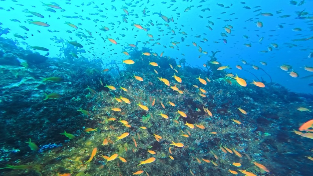 中層は、ツノクラゲ、バレンクラゲ、サルパなどの浮遊系も目立ち。地形沿いでもキンギョハナダイ群々です。