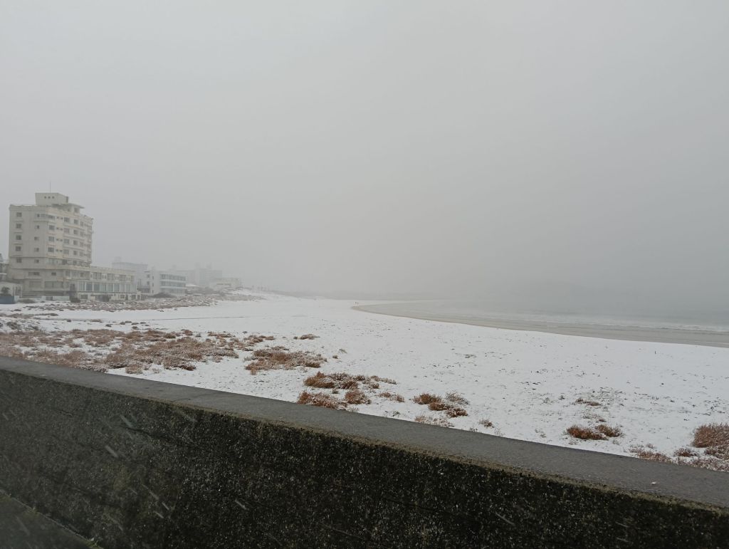 みんなが帰った後に海岸行くと真っ白な景色に。