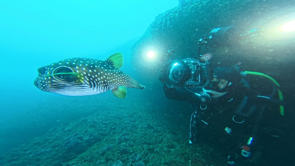 クロアナゴの身体に乗ってクリアクリーナーシュリンプがクリーニングしてたり。ハリセンボンが棚からこちらをずっと見てたりかわいい瞬間も。