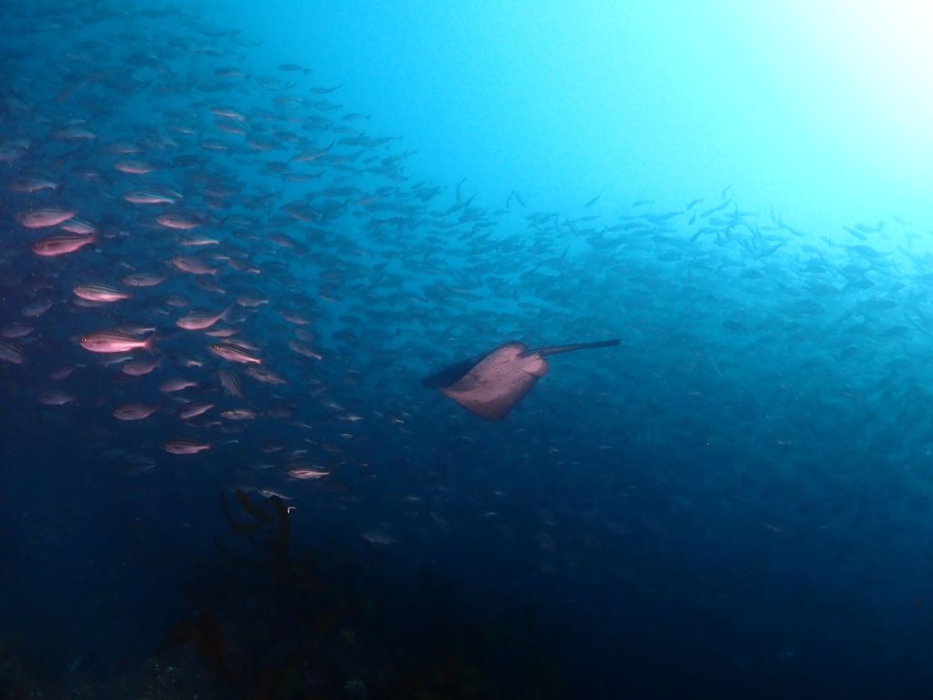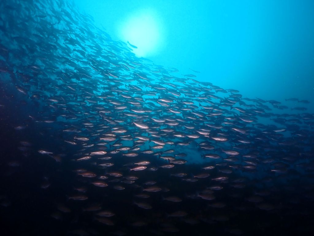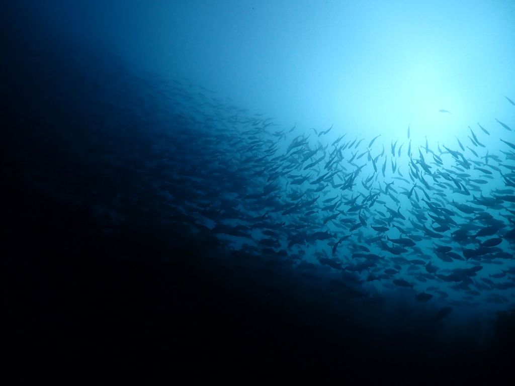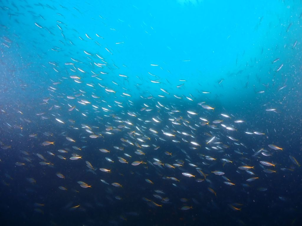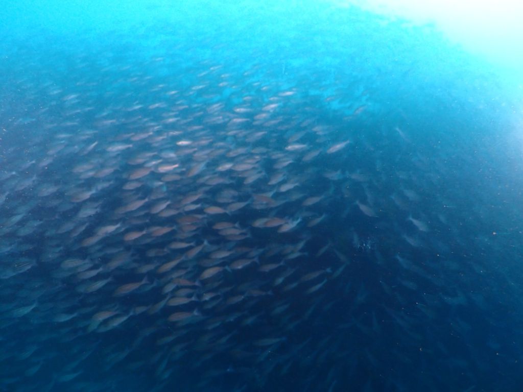 魚影が濃い中にホシエイが群れに突っ込む姿。