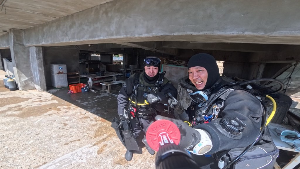 スーツの使用方法から1本目の水中は、トラブル対処など陸で説明してから実際練習してもらいました。スーツの使い方を知るとよりドライスーツの良さがどんどん分かって時期の海が楽しめちゃいます。